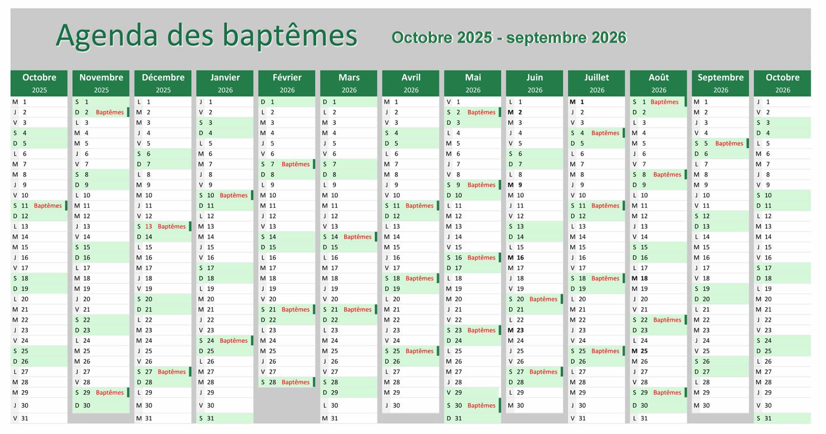 Les dates des samedis et dimanches qui sont possibles pour les célébrations de baptême sont indiquées en rouge sur fond vert