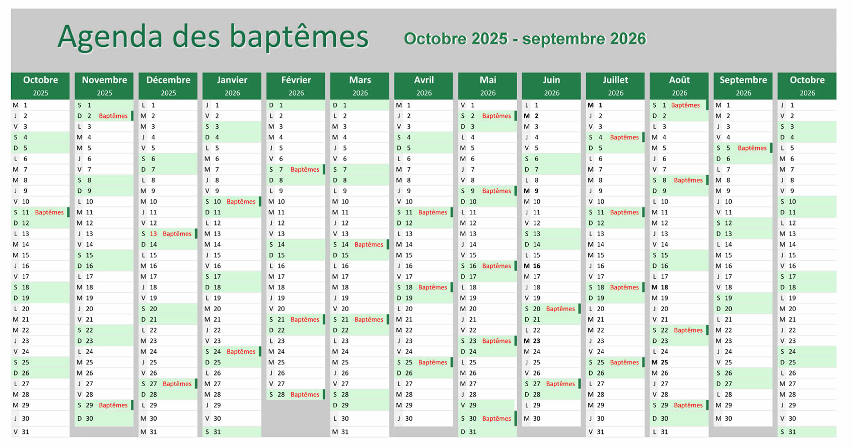 Les dates des samedis et dimanches qui sont possibles pour les célébrations de baptême sont indiquées en rouge sur fond vert.
