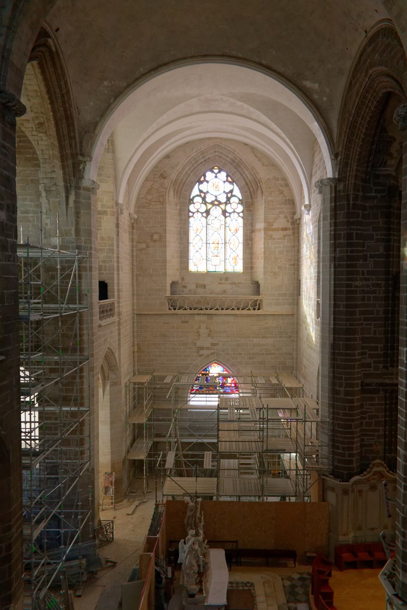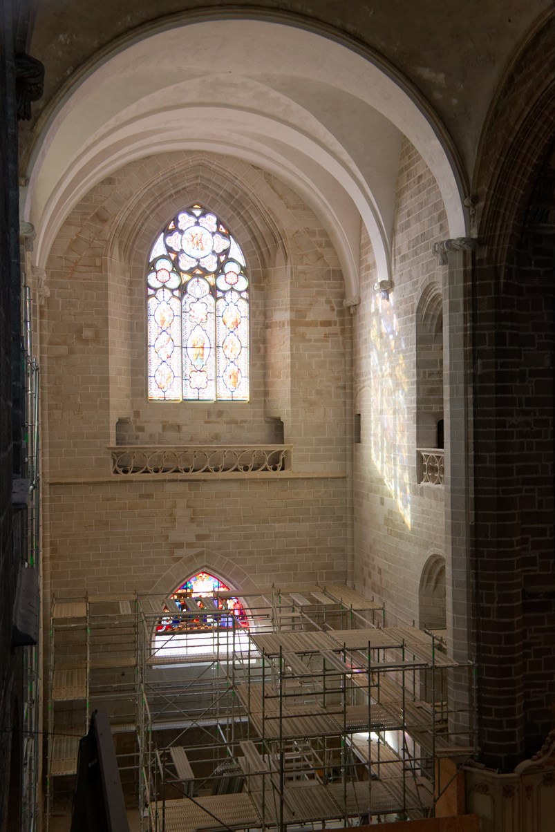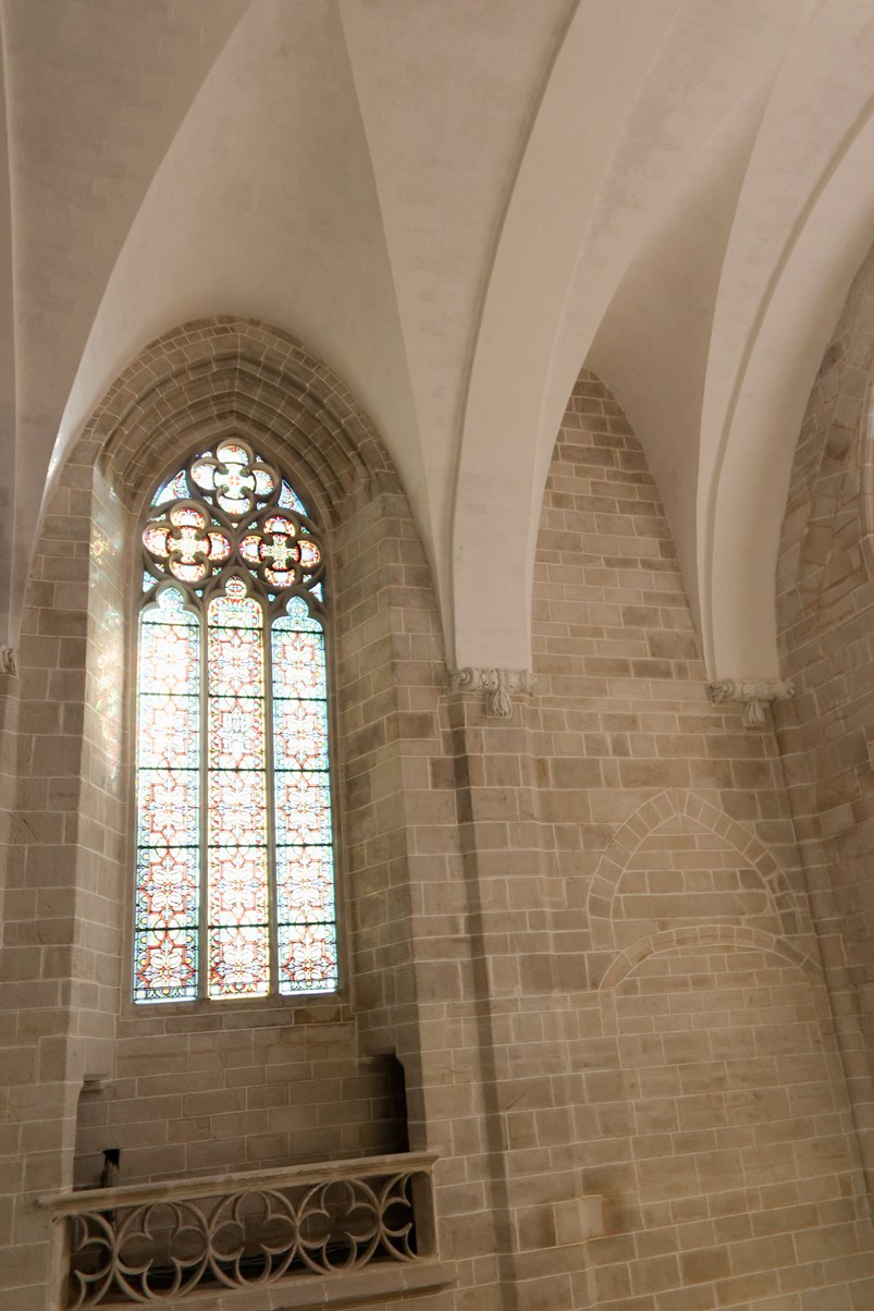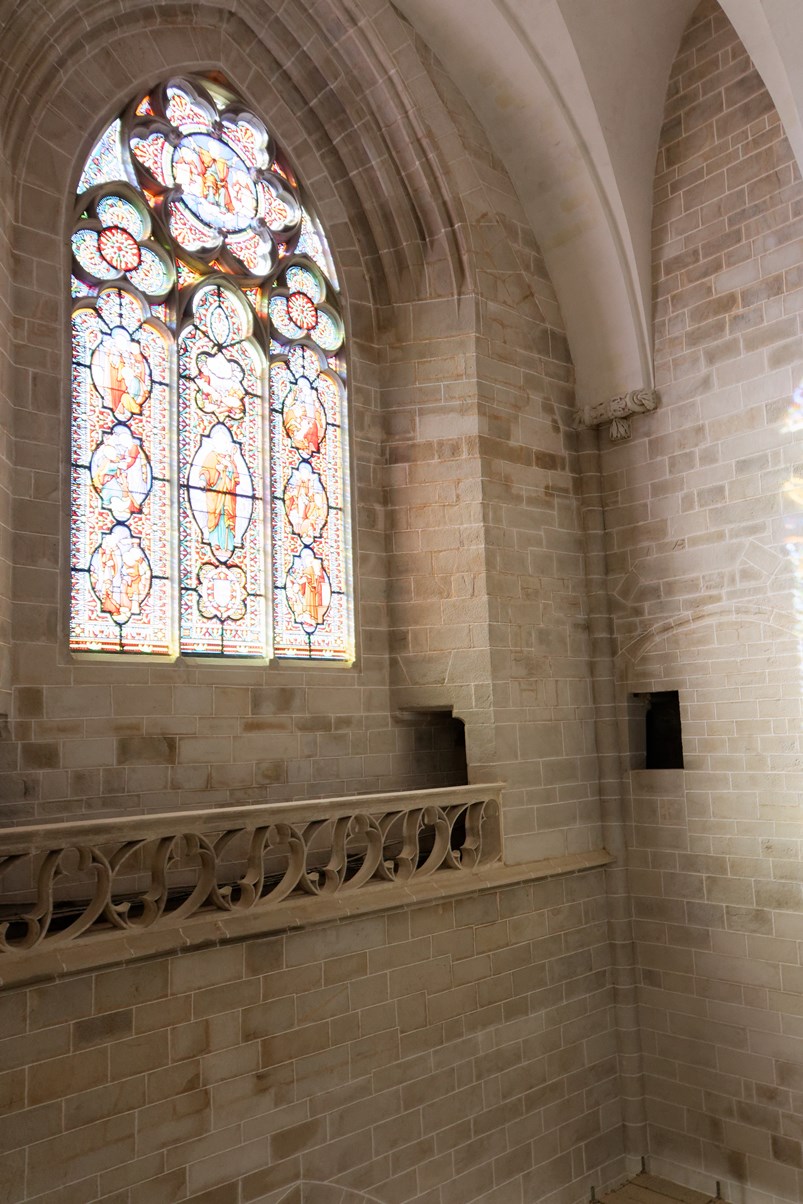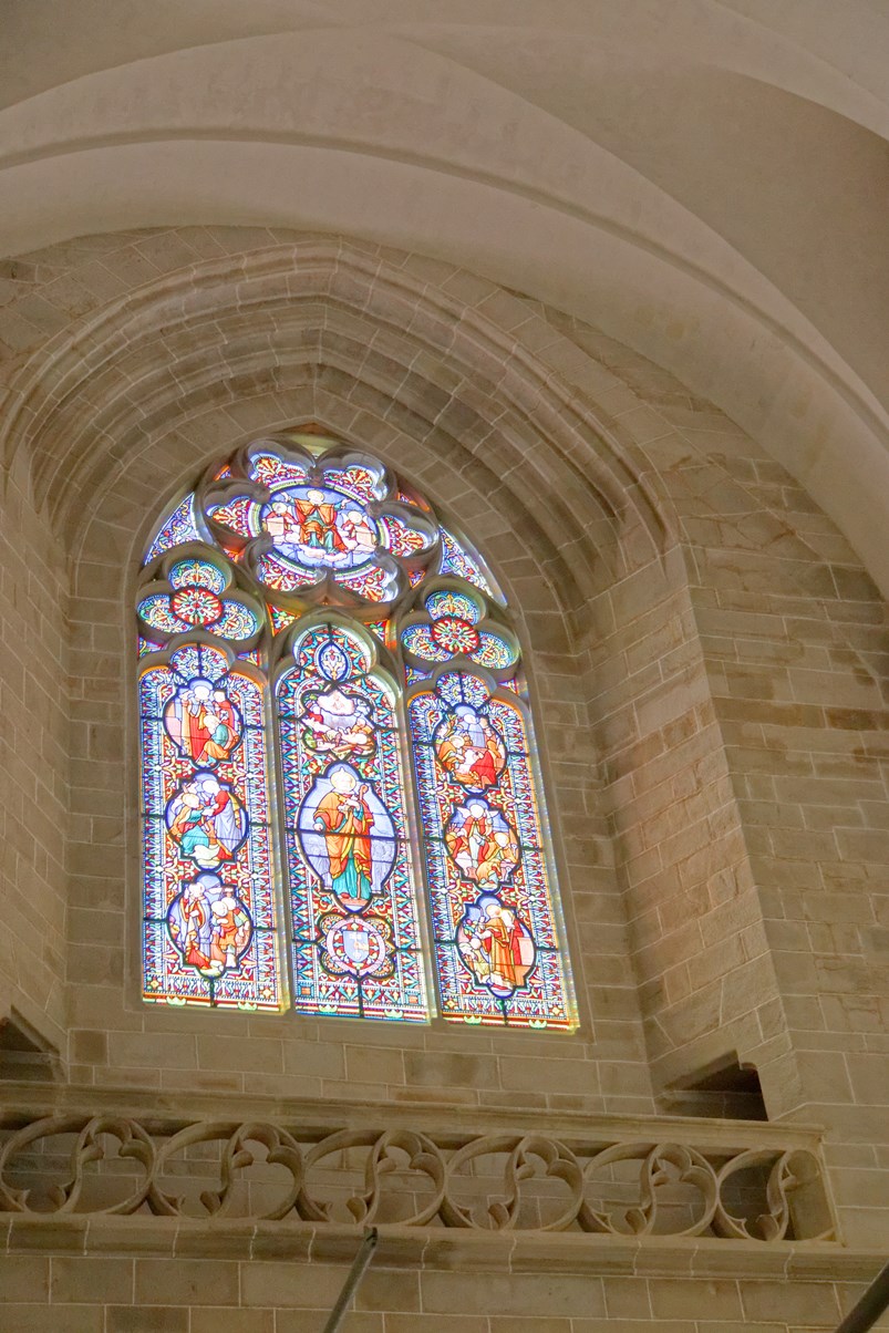 Le vitrail du bas montre la première communion de Françoise d'Amboise, tandis que celui situé au-dessus, est dédié à saint Pierre.