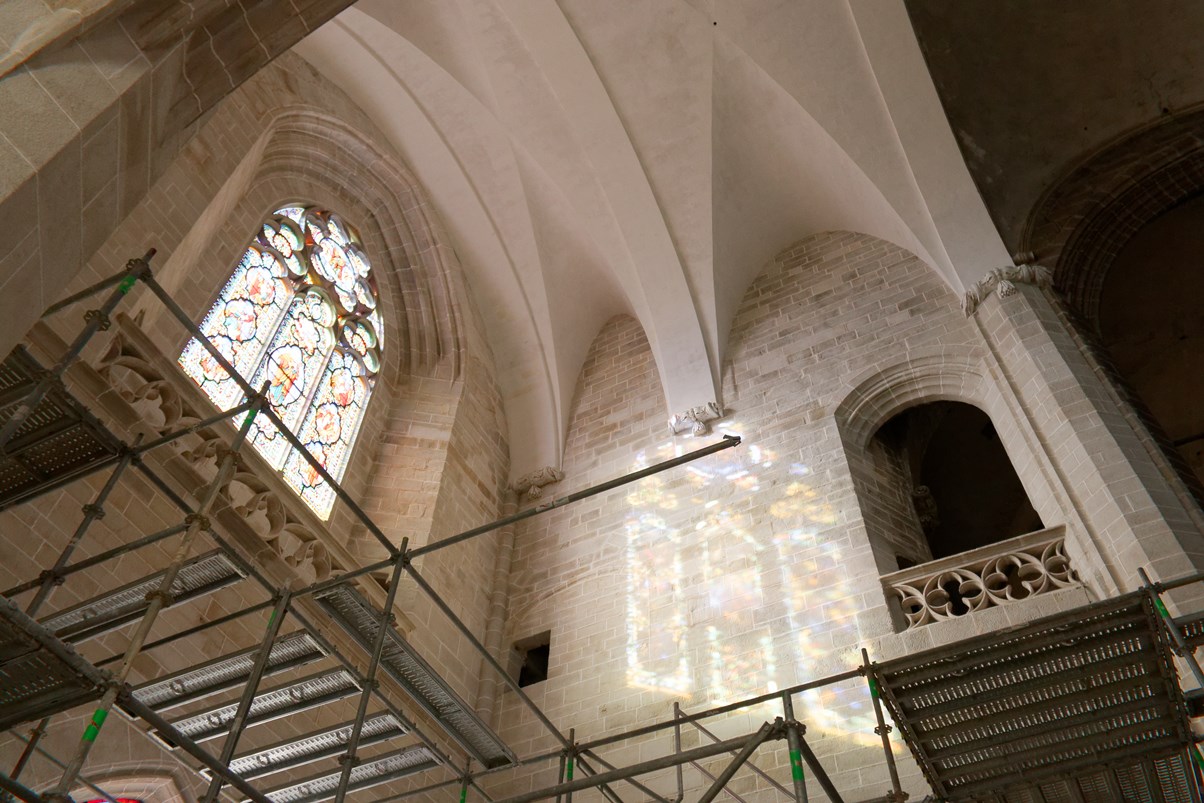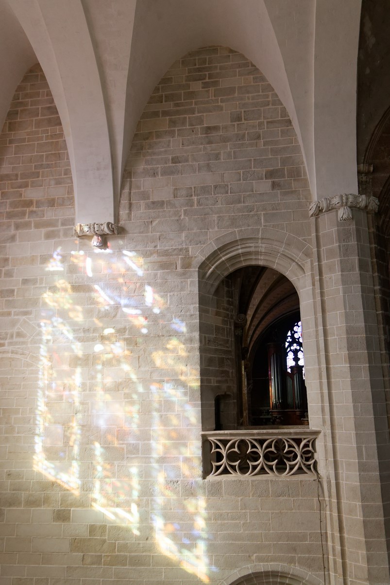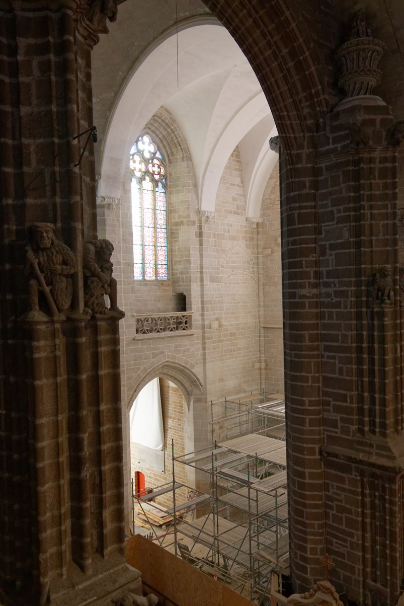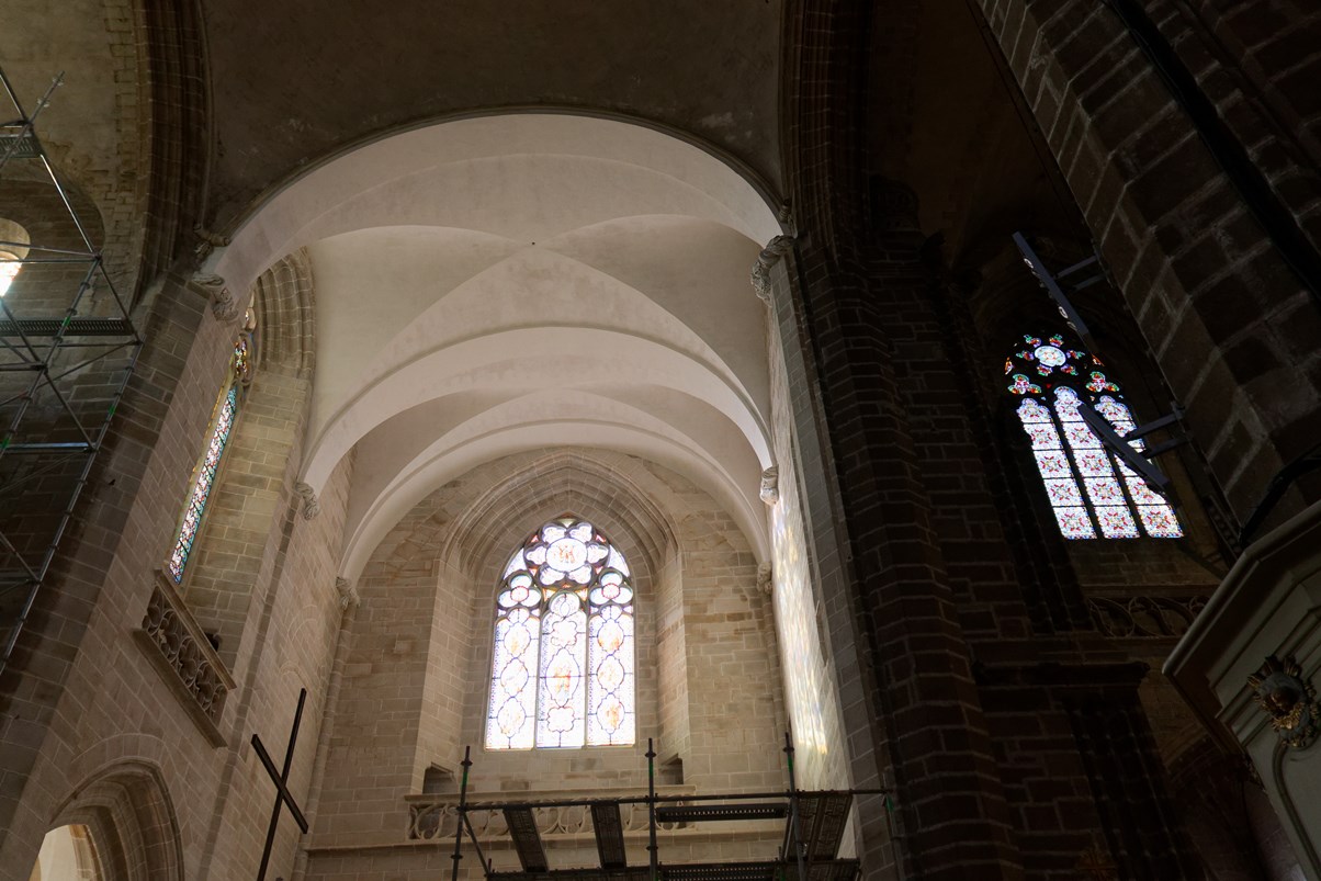 Le vitrail du bas montre la première communion de Françoise d'Amboise, tandis que celui situé au-dessus, est dédié à saint Pierre.