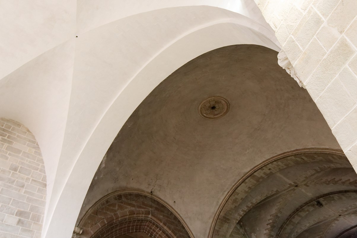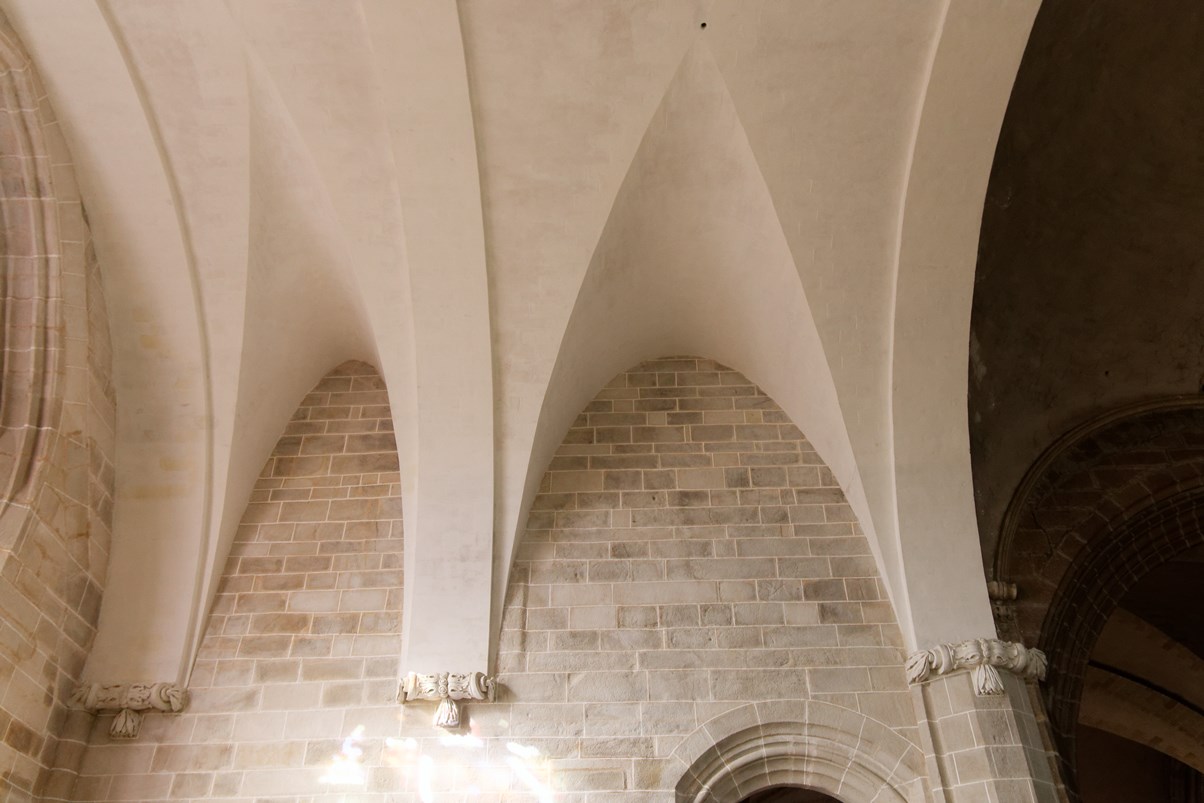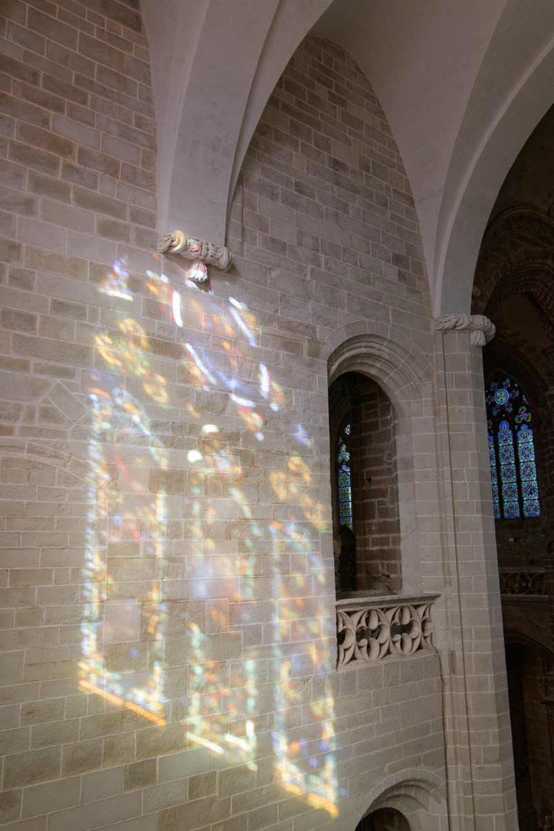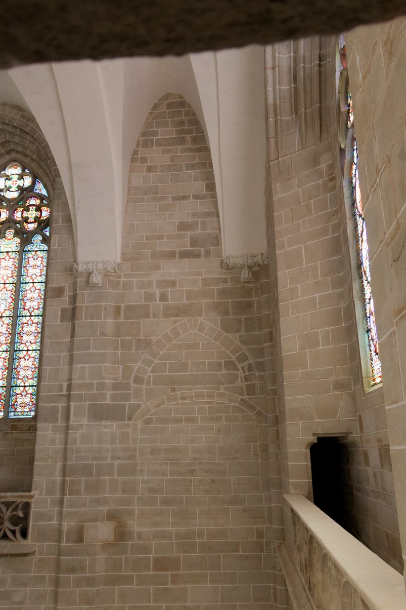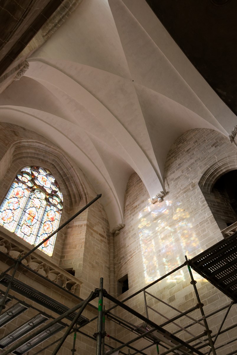 Le vitrail du bas montre la première communion de Françoise d'Amboise, tandis que celui situé au-dessus, est dédié à saint Pierre.
