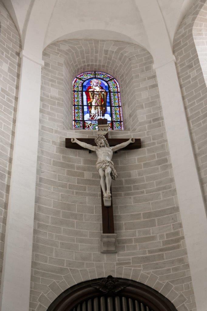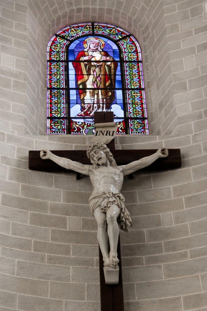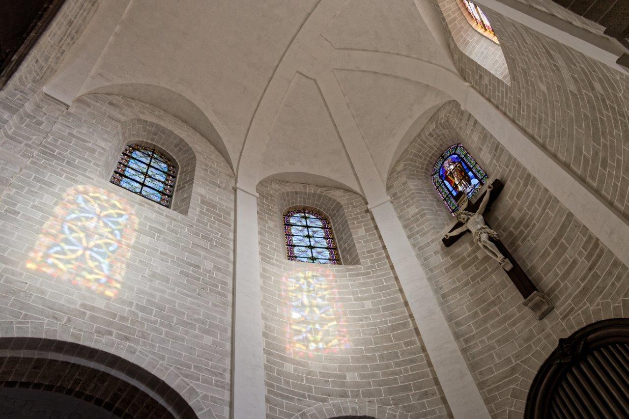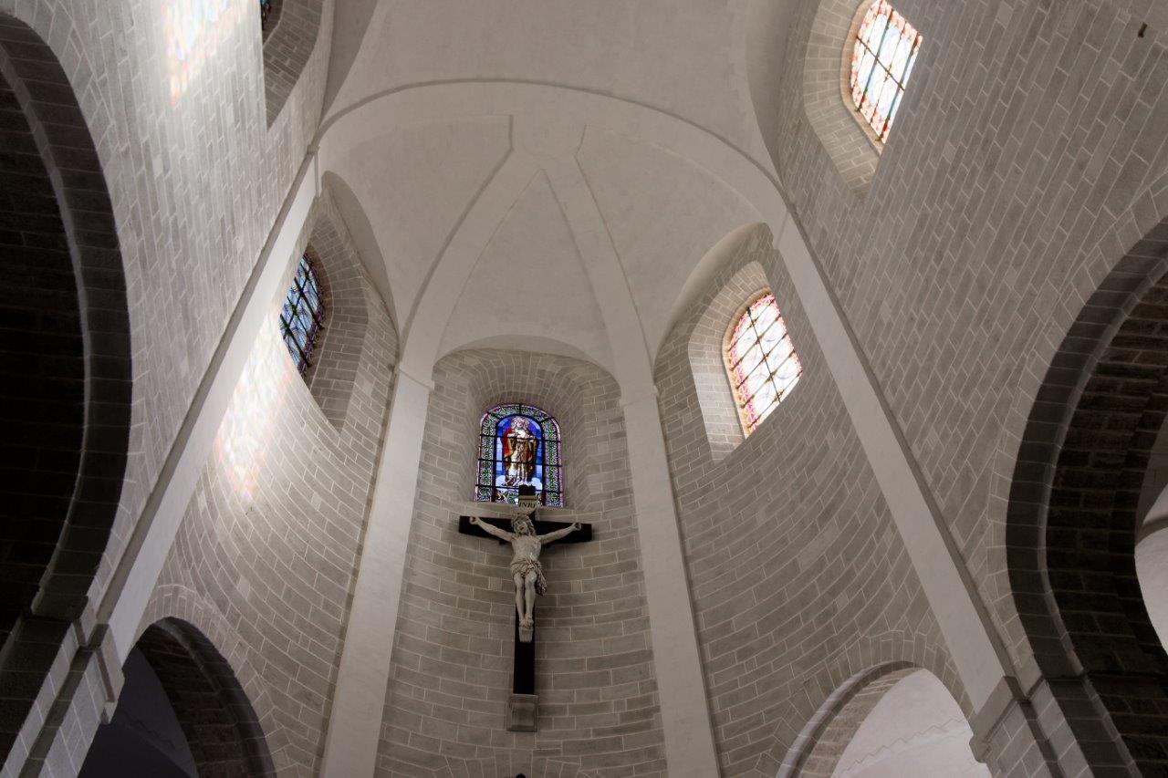 L'harmonieux équilibre des voûtes et de l'arrondi du chevet où le vitrail et la croix, qui s'offrent aux regards, provoquent un émerveillement immédiat !