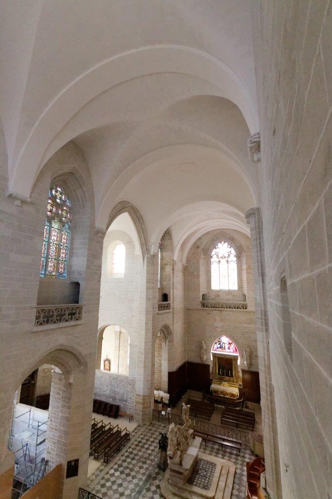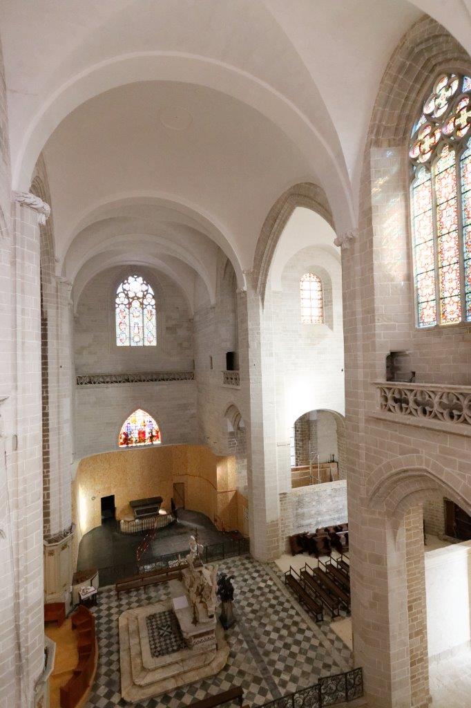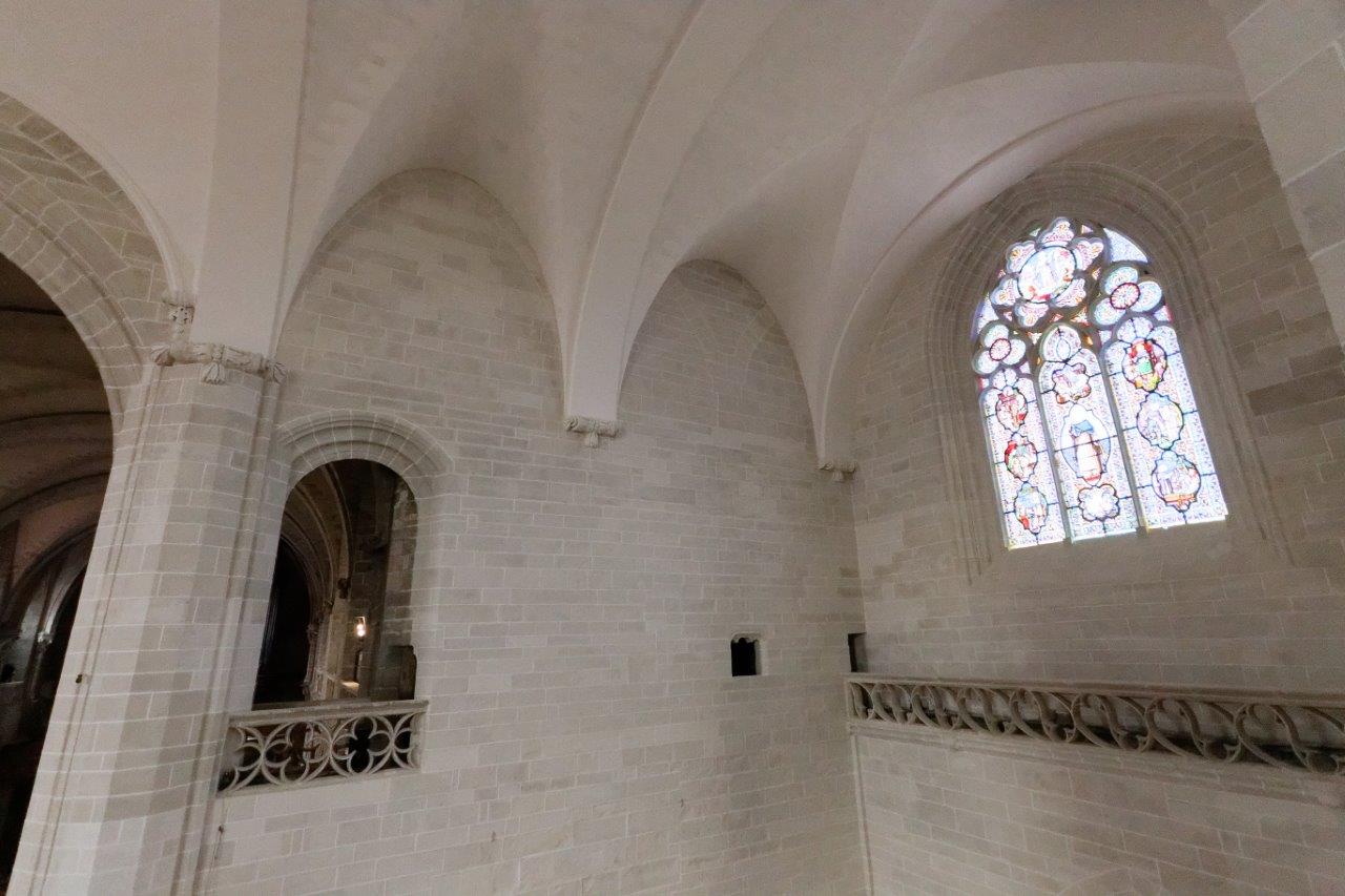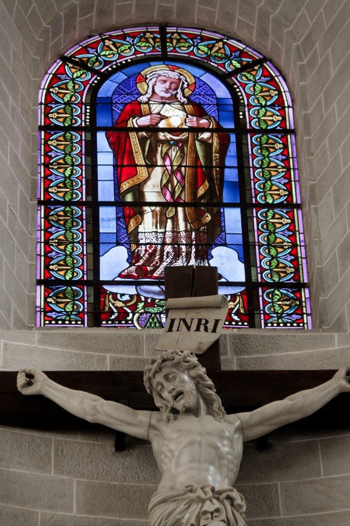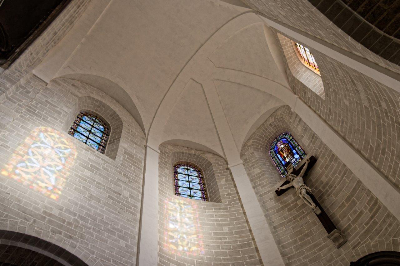 L'harmonieux équilibre des voûtes et de l'arrondi du chevet où le vitrail et la croix, qui s'offrent aux regards, provoquent un émerveillement immédiat !