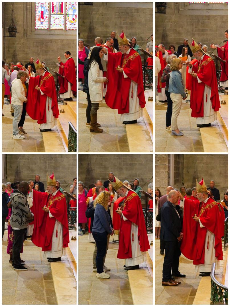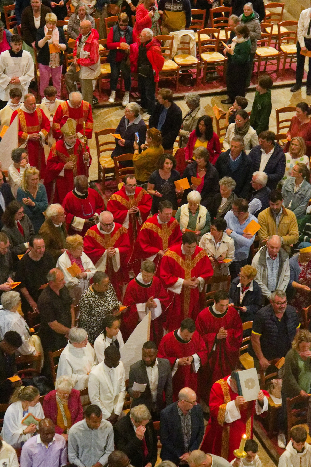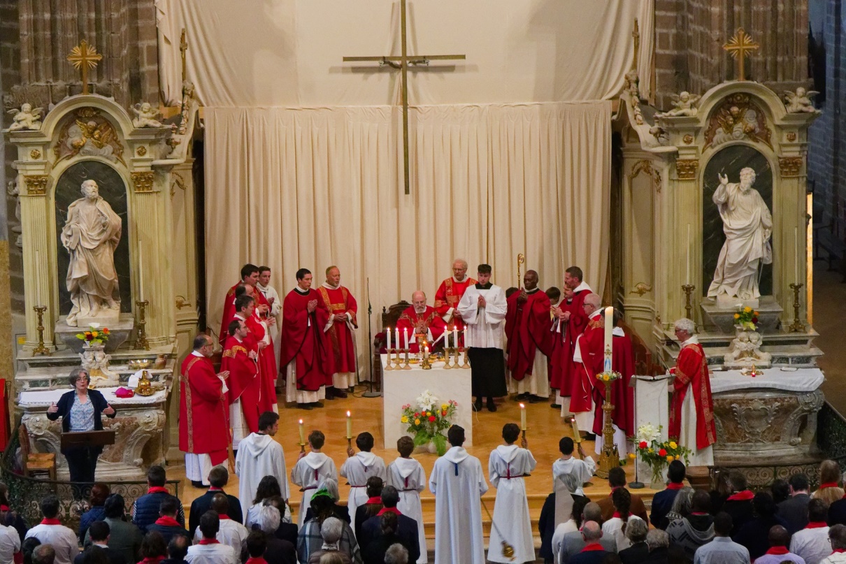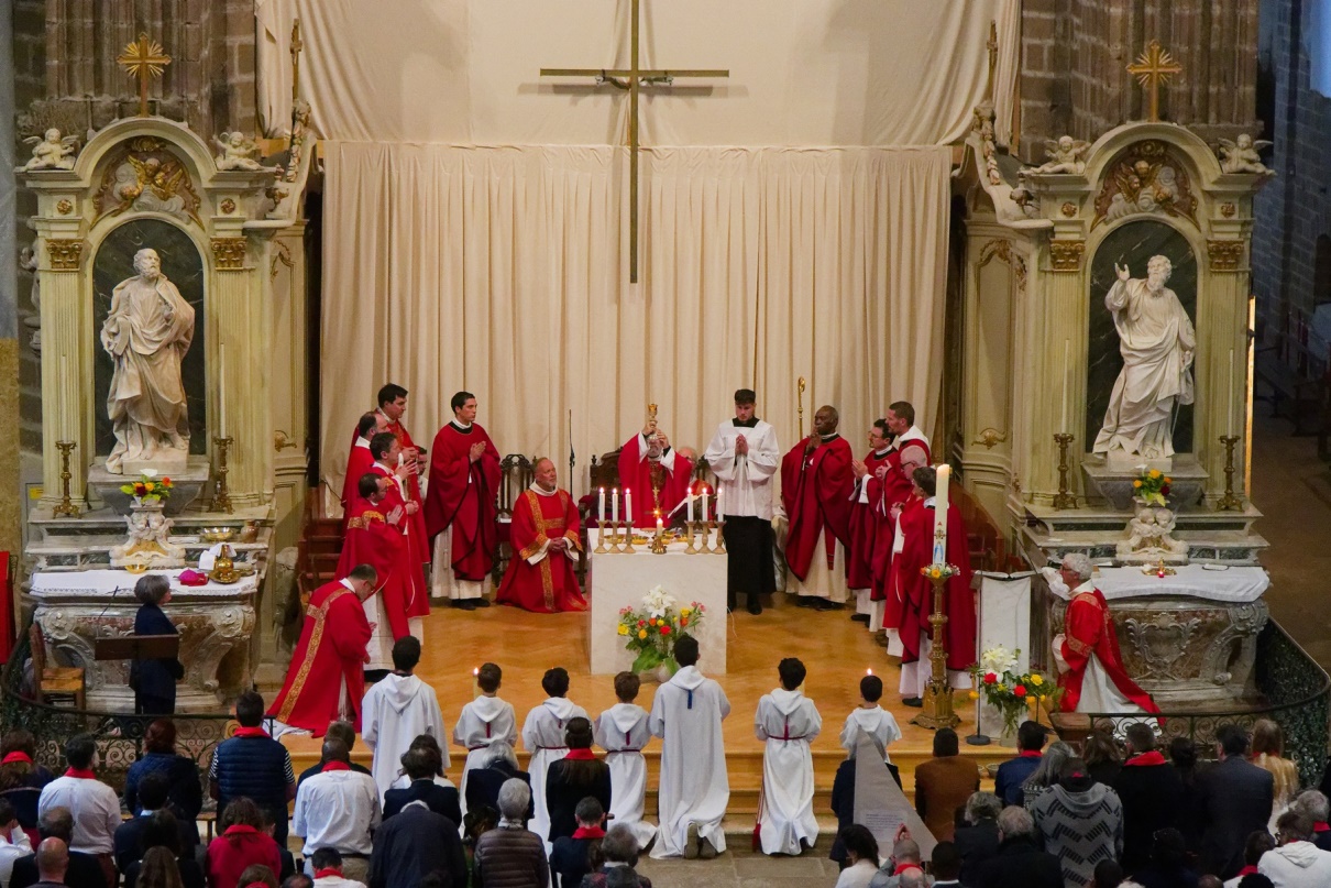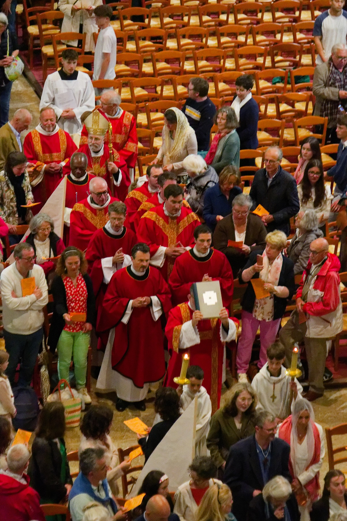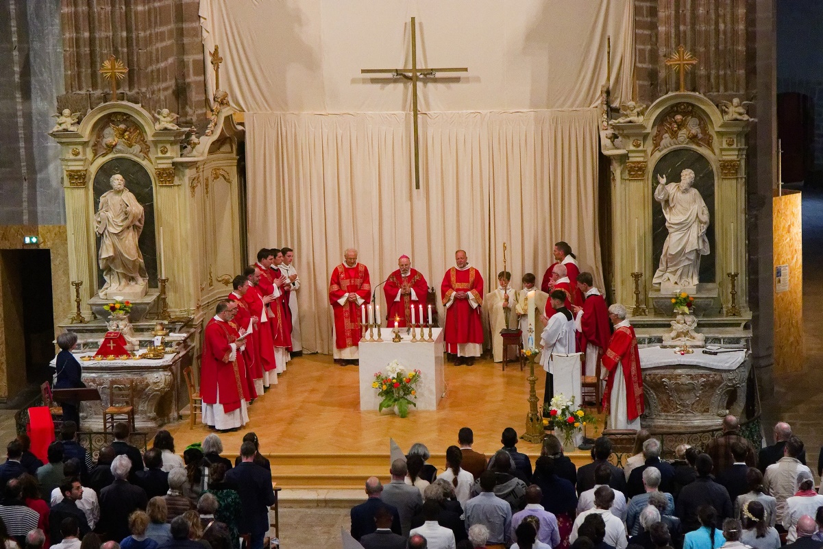 Ci-dessous un aperçu de la célébration marquée par la couleur rouge des vêtements liturgiques, symbole de l'Esprit-Saint qui embrase toute l'Eglise en la fête de la Pentecôte.