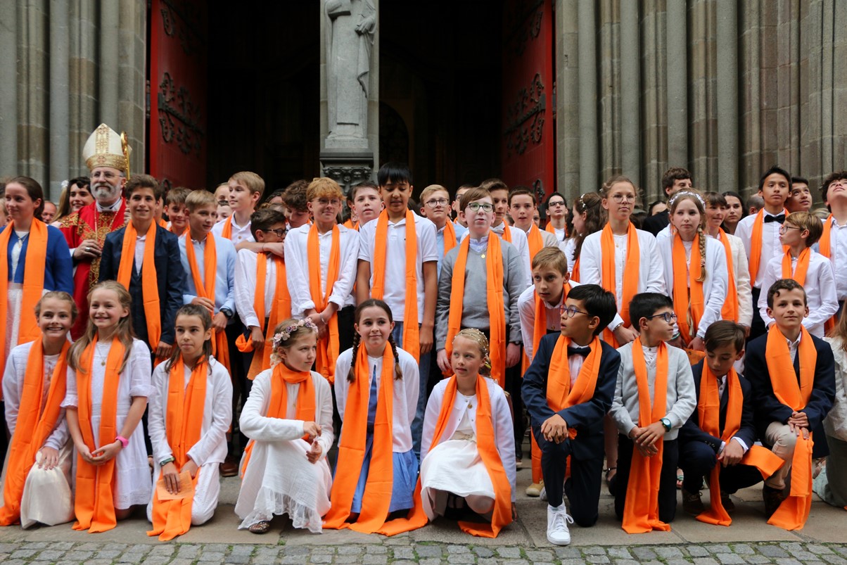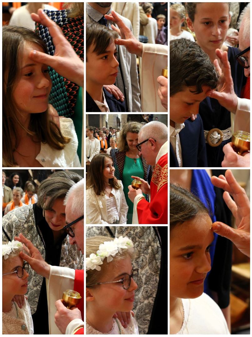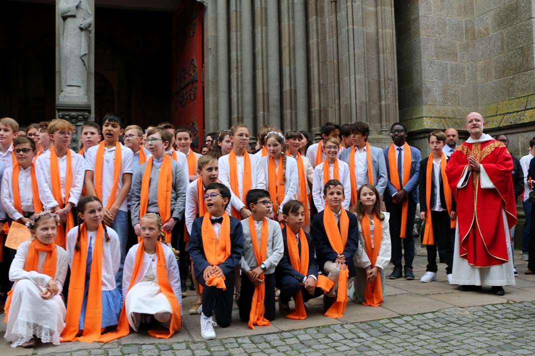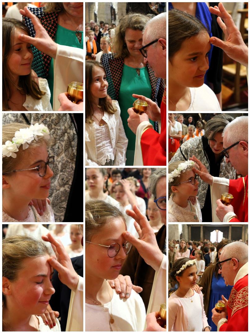 Après avoir reçu l'onction sur leur front, les jeunes se sont vu remettre une longue écharpe orange portant la date de leur confirmation, pour symboliser le feu de l'Esprit-Saint qui les a embrasés à l'instant même. Que cette écharpe leur soit précieuse et qu'elle puisse leur rappeler la présence permanente de l'Esprit-Saint dans leur vie.
