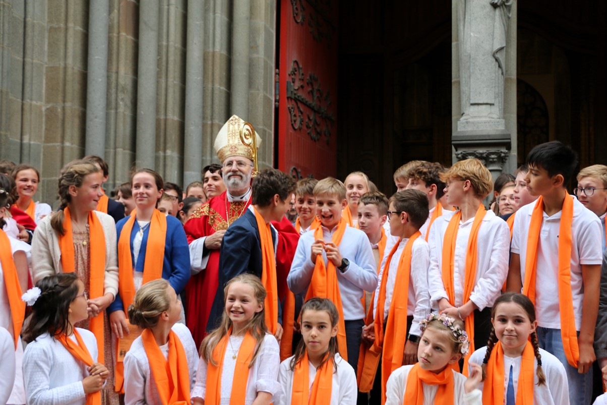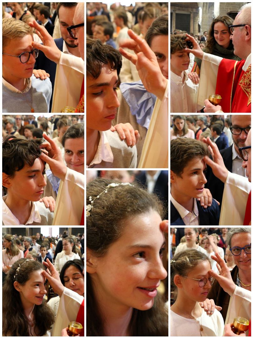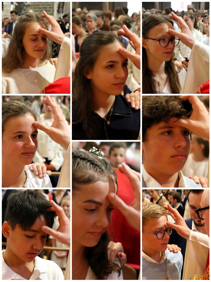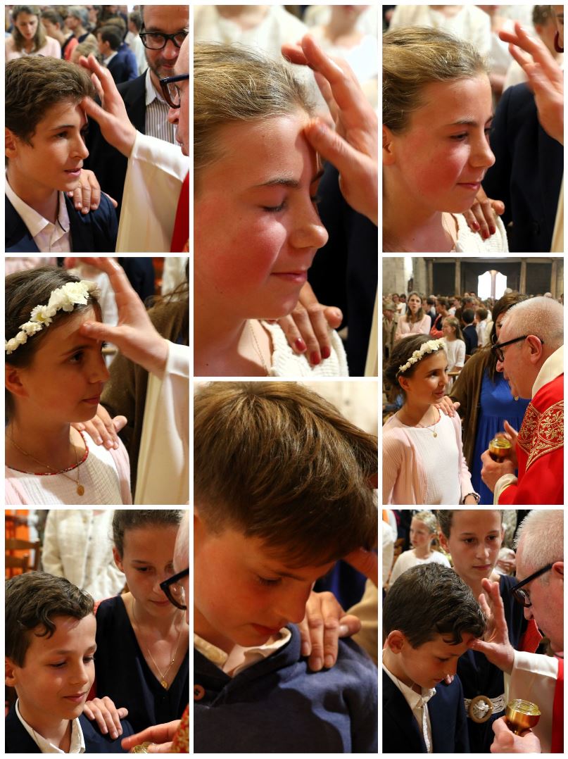 Après avoir reçu l'onction sur leur front, les jeunes se sont vu remettre une longue écharpe orange portant la date de leur confirmation, pour symboliser le feu de l'Esprit-Saint qui les a embrasés à l'instant même. Que cette écharpe leur soit précieuse et qu'elle puisse leur rappeler la présence permanente de l'Esprit-Saint dans leur vie.