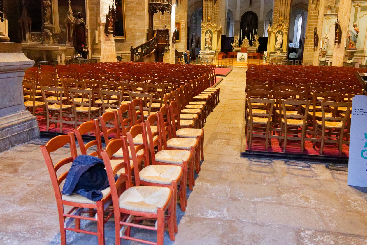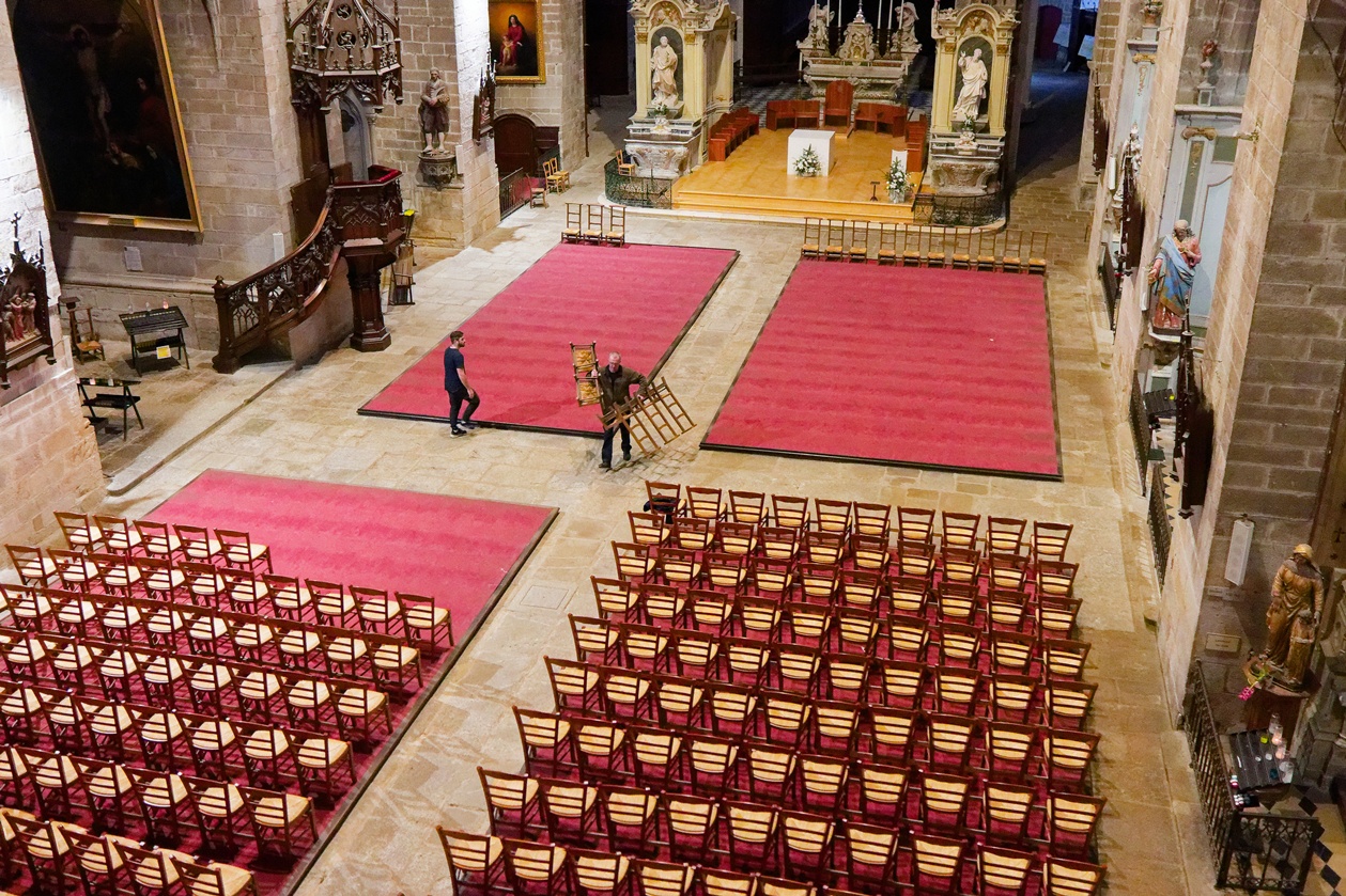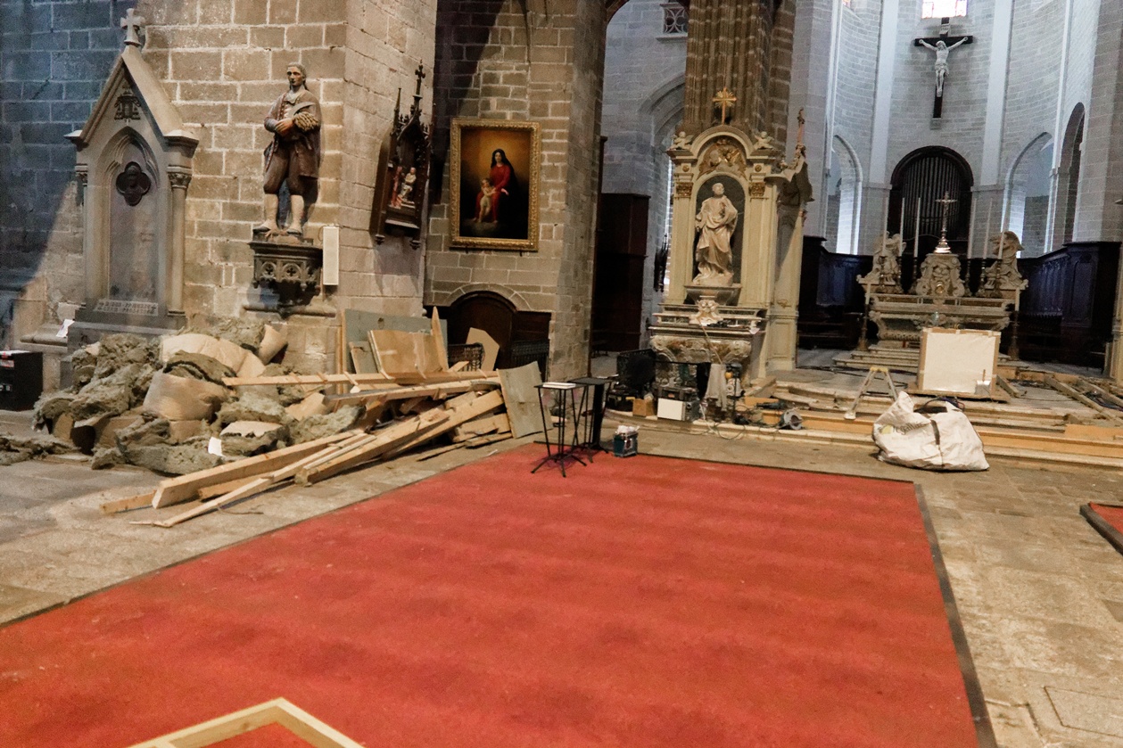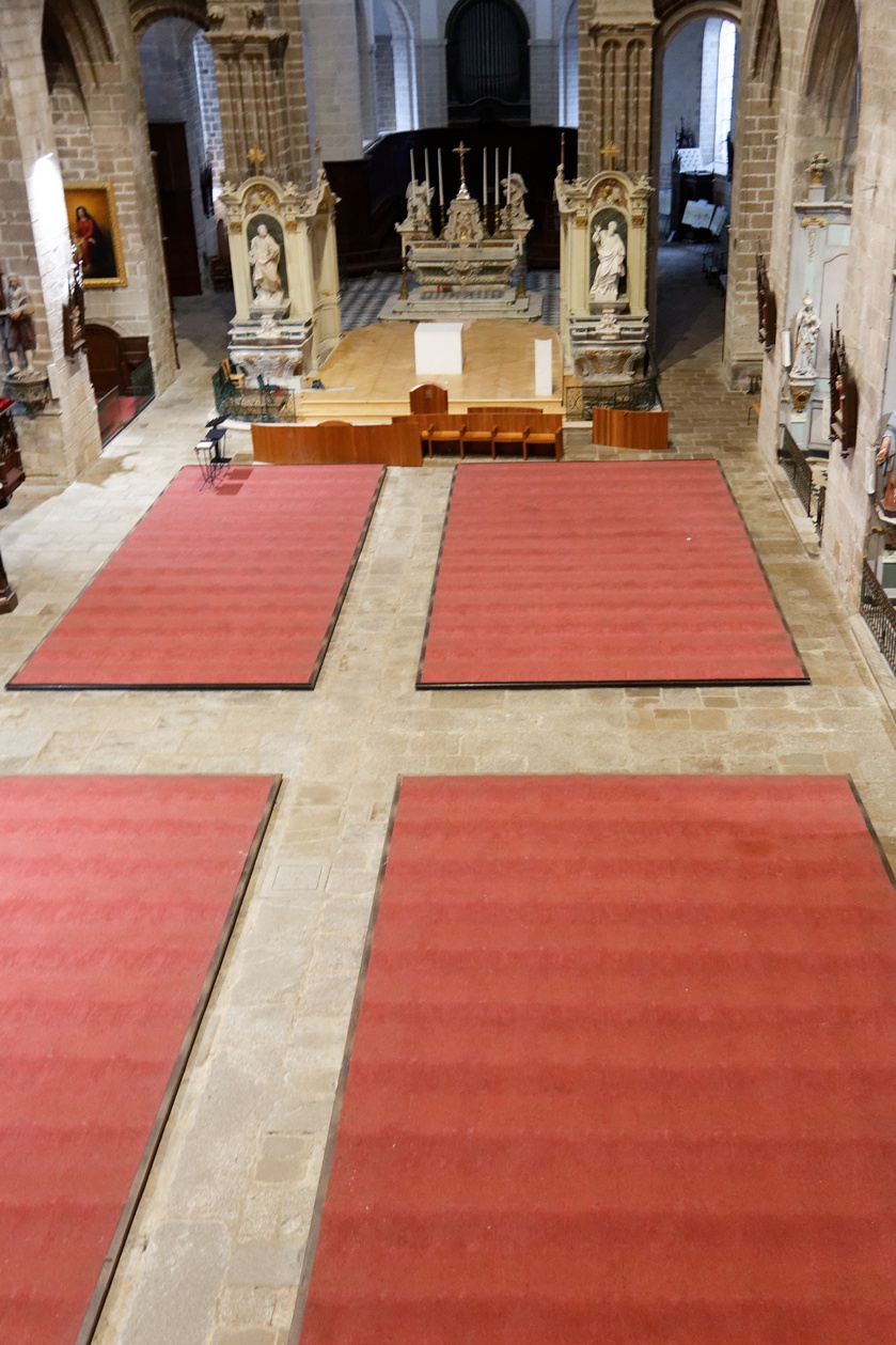 Le retrait des chaises de la nef, nous laisse déouvrir la belle moquette rouge qui avait été posée en 2007, lors de l'installation d'un chauffage par le sol. Cette installation n'avait jamais bien fonctionné, aussi cette moquette et le rehaussement en bois sur lequel elle était posée, seront retirés dans quelques jours. Nous retrouverons en 2027, un sol en dalles de granit.