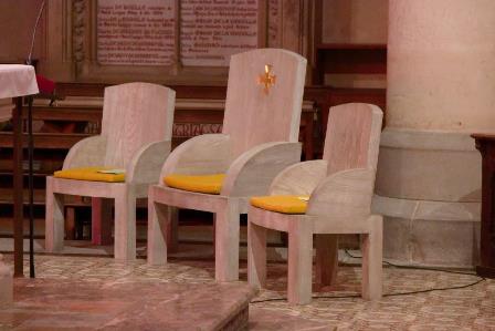 Voici tous les artisans issus de la région qui ont contribué à la réalisation de cet ensemble. L'architecte de l'ensemble et du design de chaque objet fut Madame Dominique Pollet ; Le ferronier d'art pour les pupitres et le lutrin d'ambon : Gaël Luc et sa collaboratrice Alexia Le Chantoux ; L'ébéniste pour les sièges et la crédence : Matthieu David ; La patine et la dorure bois : Anne Padovani ; le tapissier pour les coussins ; l'atelier Michel. Tous les matériaux sont nobles et durables.