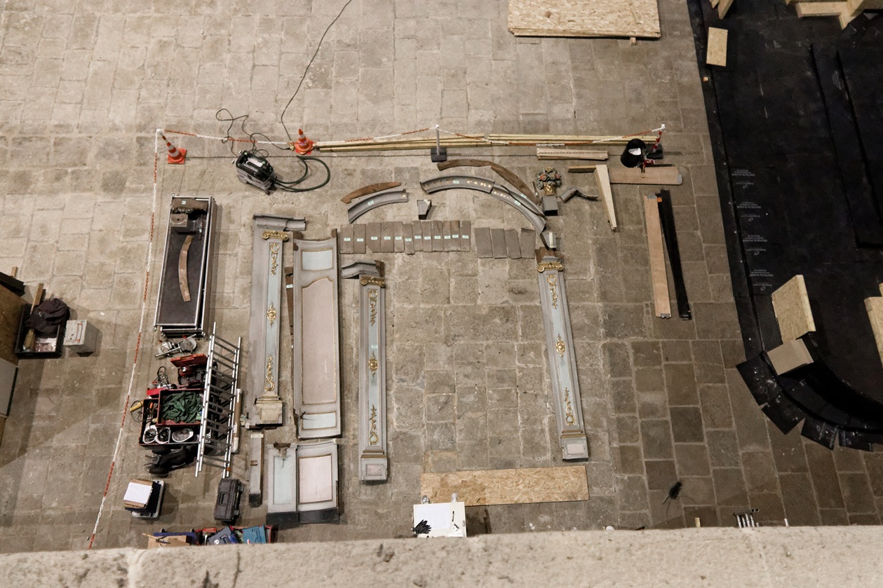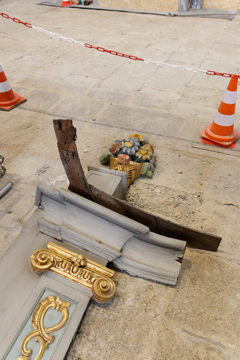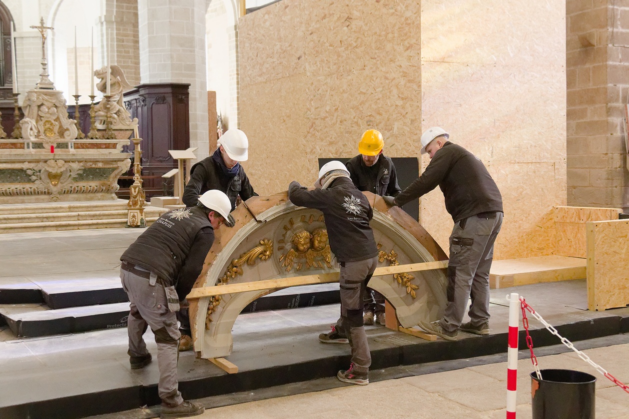 On n'imagine pas les allées et venues que nécessitent un tel chantier de restauration, pour déposer les boisieries, dans l'ordre afin de n'en perdre aucune, et pour le faire avec précaution ! Monter, descendre ... manoeuvrer, et recommencer.