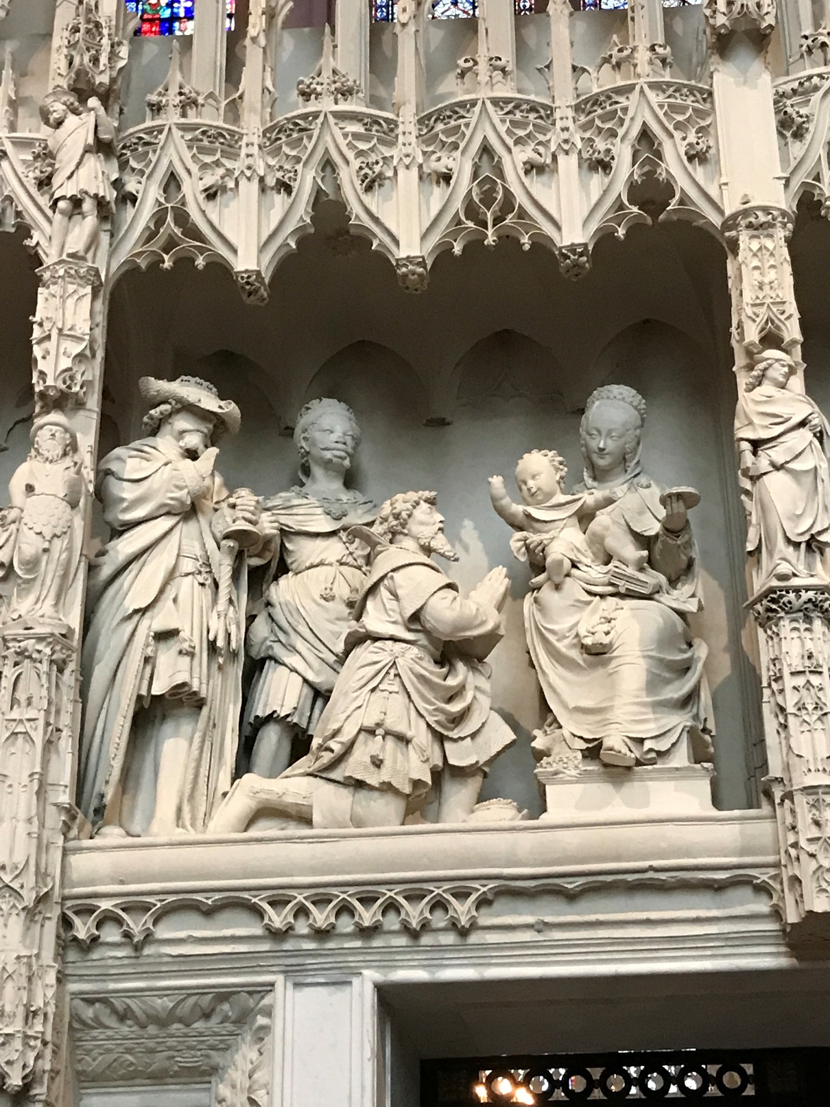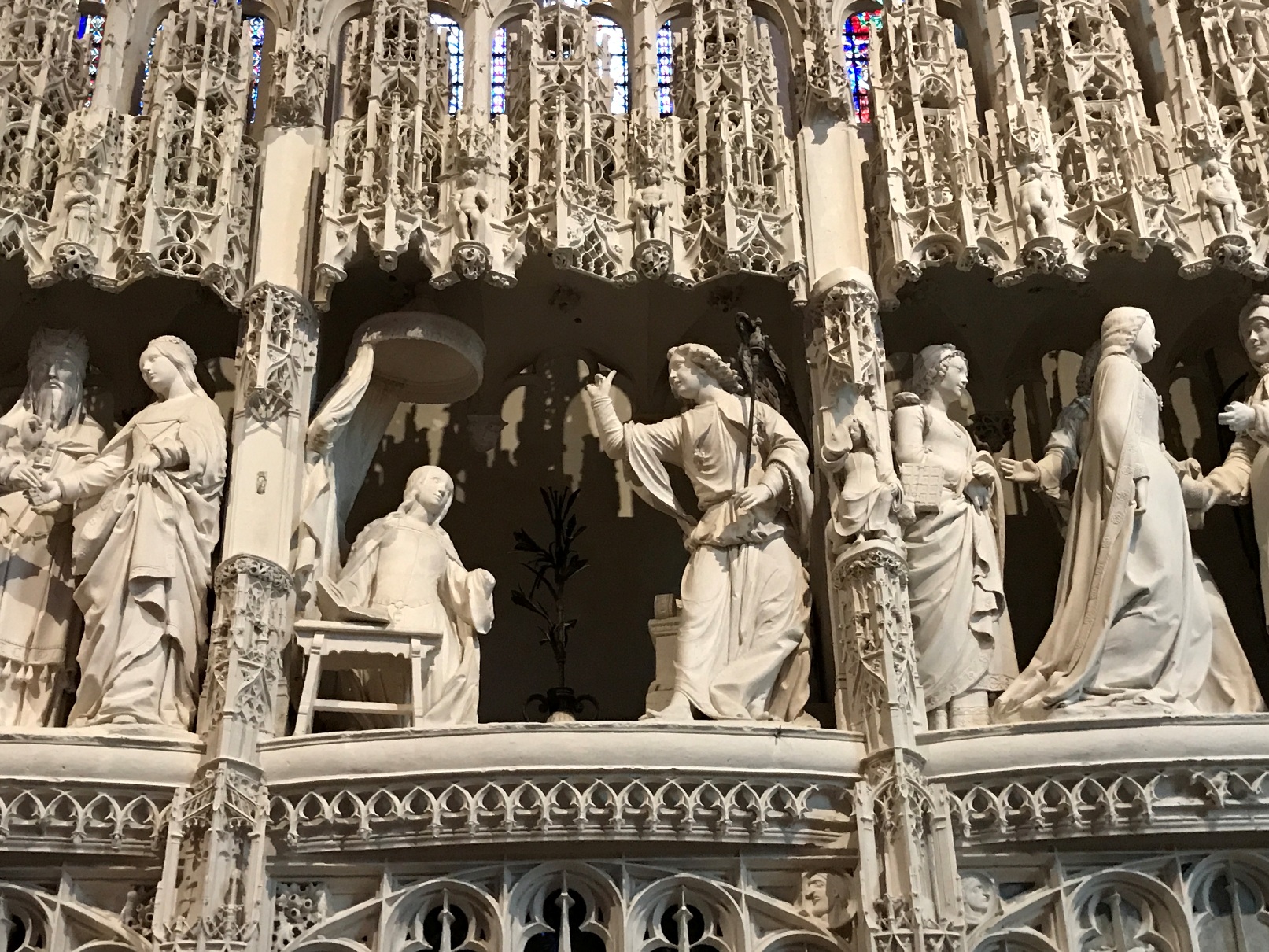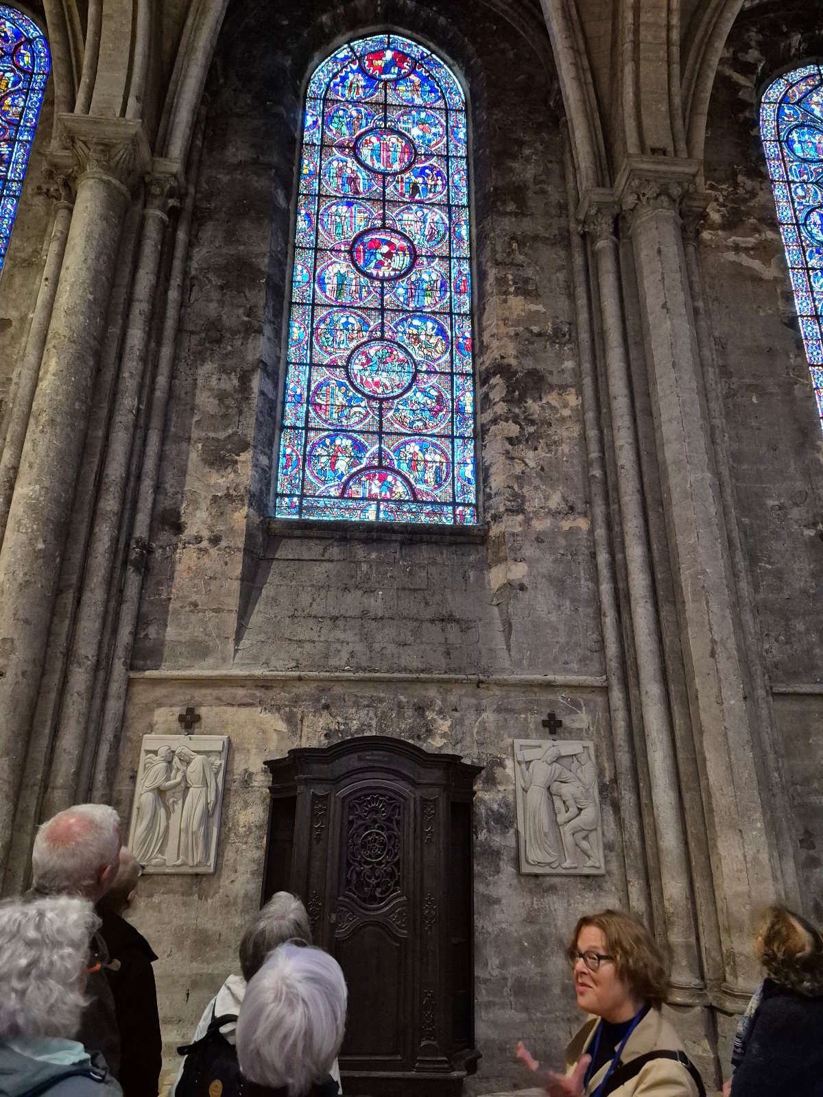 Aujourd'hui, la cathédrale a été presqu’entièrement rénovée, puisque seuls les murs intérieurs des bas-côtés n’ont pas été nettoyés puis blanchis au lait de chaux. Nous avons pu voir le nouveau mobilier liturgique, mais surtout nous avons été saisis par la beauté du tour extérieur du chœur, qui se présente comme une étonnante frise sculptée datant des années 1520-1530. Chapeau les artistes ! On pourrait comparer cette frise à une longue BD retraçant toutes les scènes de l’évangile. Une pure merveille !