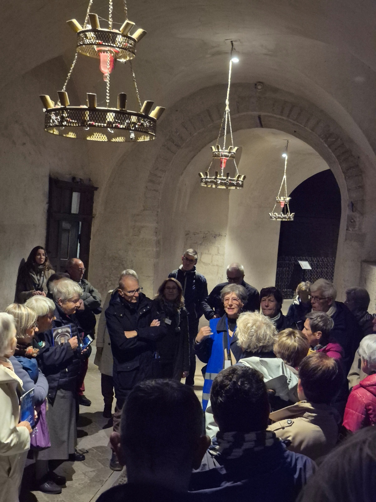Ensuite, nous sommes descendus dans la crypte, pour une 2ème visite guidée, avec une approche spirituelle pour le pèlerinage jubilaire « Pèlerins d’espérance ». Art, culture et foi ! Notre guide nous a, en quelque sorte, pris par la main pour prier, chanter et en fin de parcours, nous proposer de renouveler les promesses de notre baptême devant le magnifique baptistère.