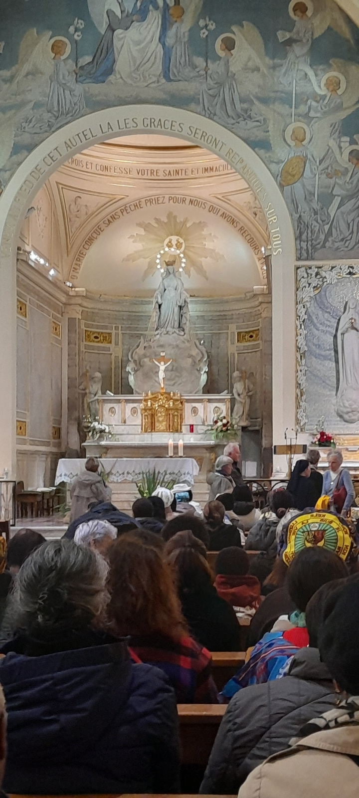 Nous ne sommes pas restés à la messe, car nous étions attendus dans une salle attenante, pour regarder une vidéo racontant l’origine de cette chapelle et les événements qui s’y sont déroulés en 1830, en faveur de Catherine Labouré, humble religieuse de Saint-Vincent de Paul.