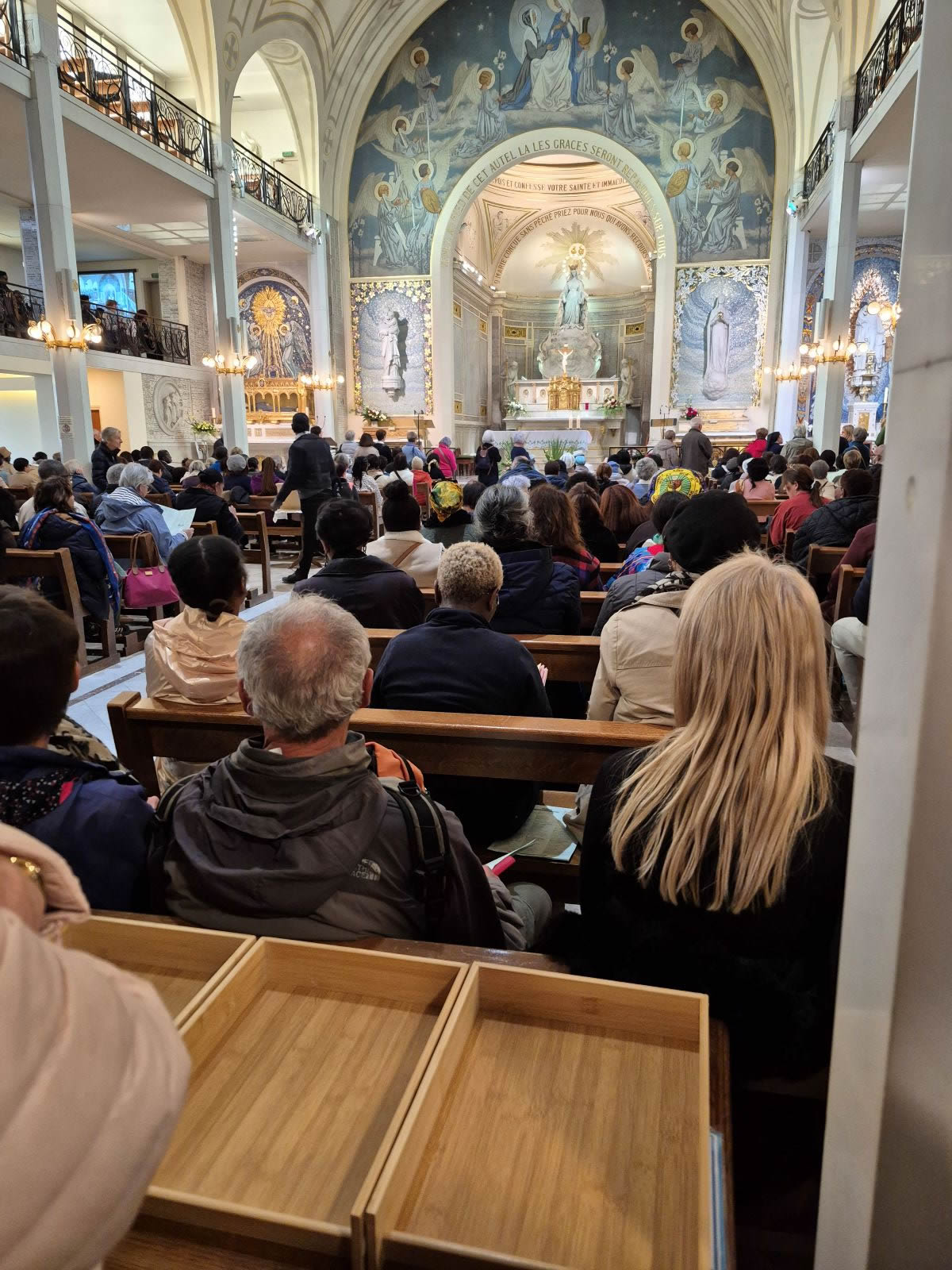 Si nous étions arrivés à une autre heure de la journée, ce qui nous aurait frappés, c'est la ferveur populaire de ce lieu. Car à toute heure de la journée, (en dehors des messes) il y a toujours du passage et surtout des personnes agenouillées sur les marches du choeur, et qui, dans une attitude d'humilité, répondent à l'invitation de la Vierge Marie : "Venez au pied de cet autel, là, les grâces seront répandues sur tous."