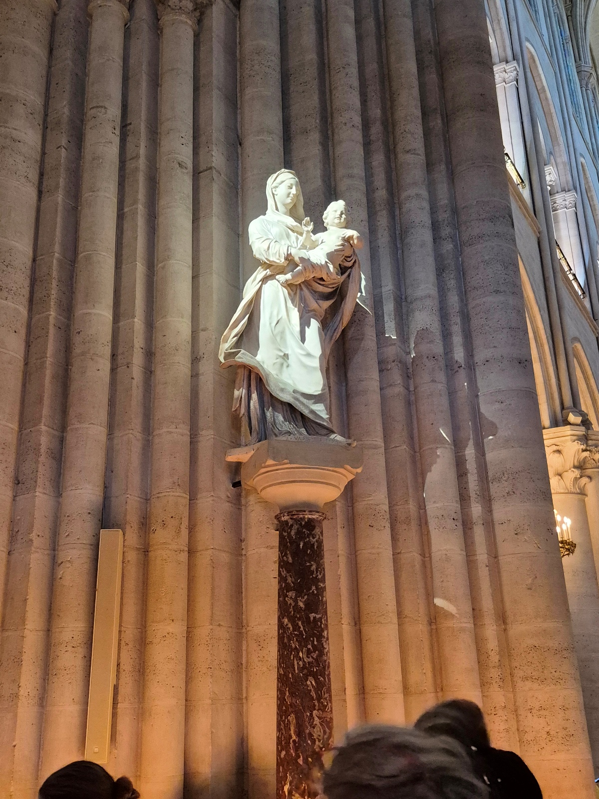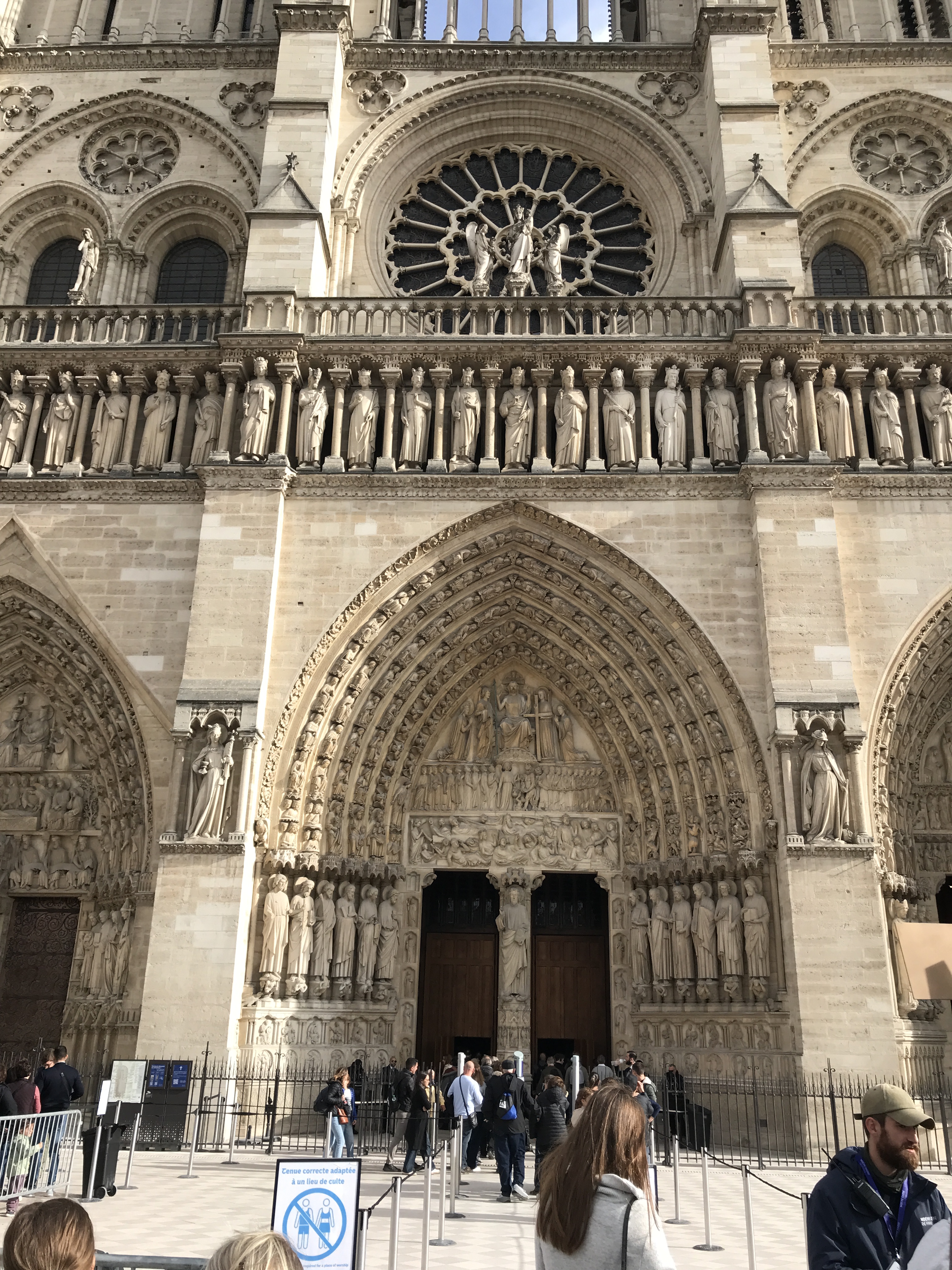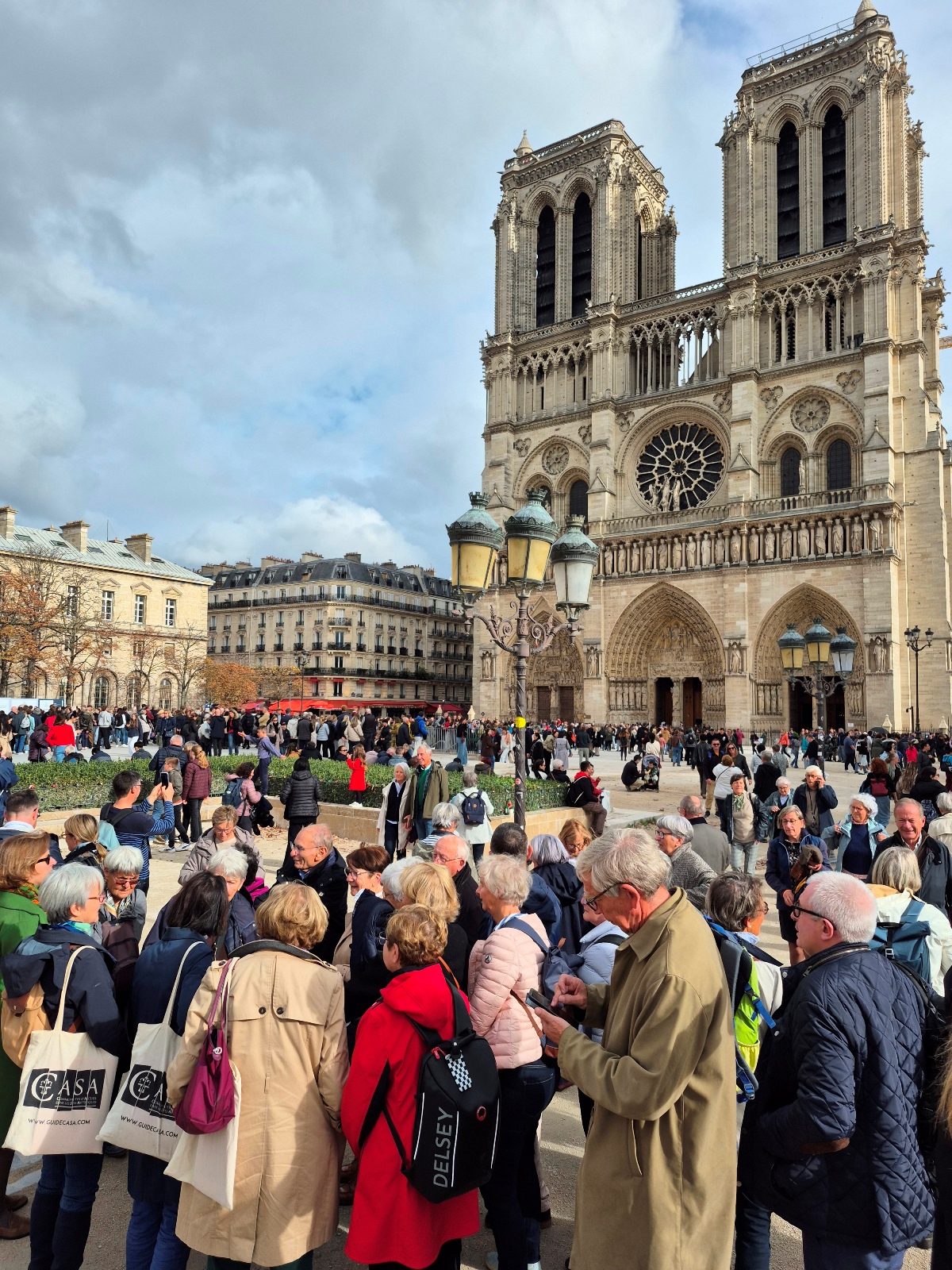 Lorsque nous sommes arrivés à pied, depuis le quartier de l’Odéon, quelle n’a pas été notre surprise de voir une foule de gens, les uns visiteurs contemplatifs perchés et assis sur les marches d'une estrade dressée face à la cathédrale, les autres disposés en longue file d’attente de plus de 100 m qui attendaient leur tour pour pouvoir entrer dans l’édifice !