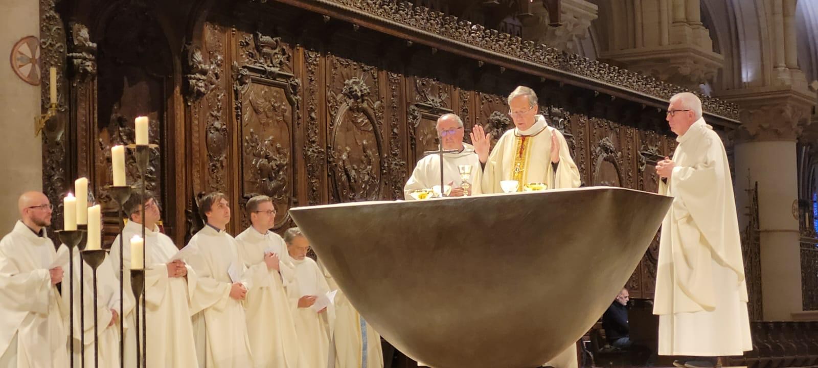 A la fin de la messe, après le chant du Salve Regina, tous les prêtres remontent vers le nouveau baptistère de la cathédrale, placé à l'entrée de la nef, pour chanter l'Angelus, puisqu'il est 19 heures, et tous les fidèles se regroupent autour des prêtres. Magnifique !