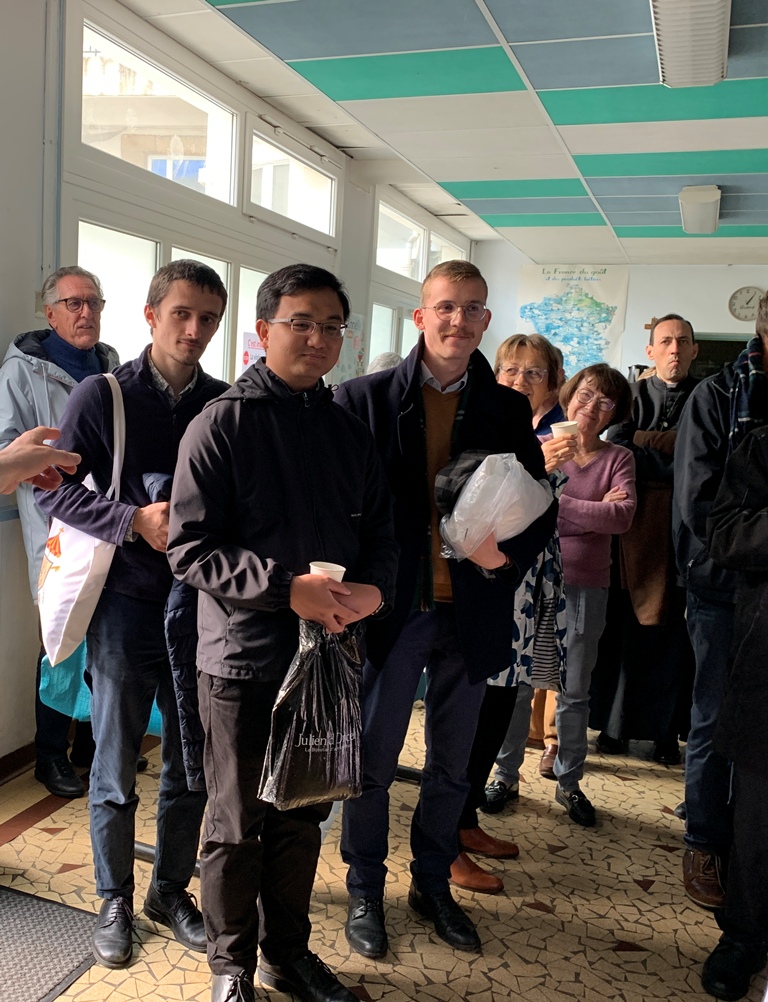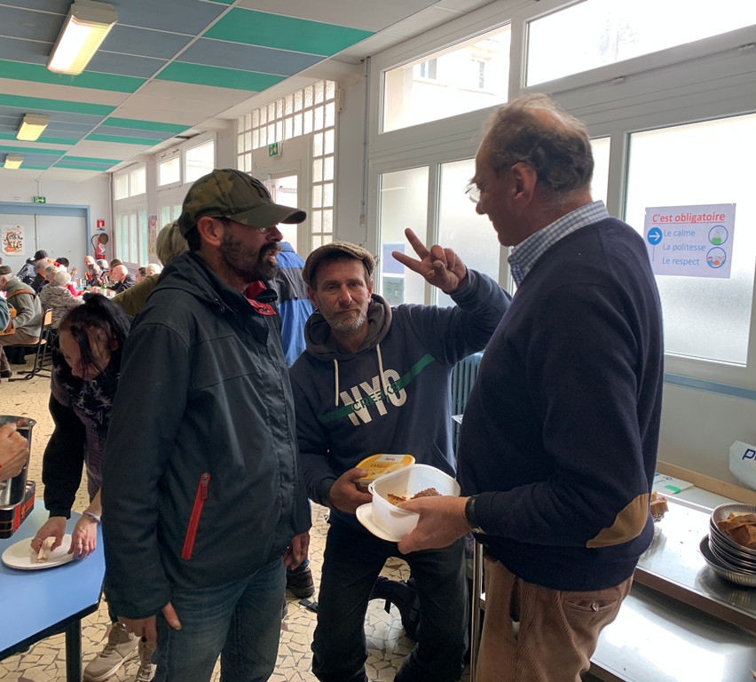 Ce dimanche 16 novembre, nous étions entre 80 et 90 convives – gens seuls, paroissiens,membres de la conférence SVP, le Père Marivin, le Père Perrot, trois sœurs de la la Charité Saint Louis nouvellement arrivées et trois jeunes en propédeutique avec leur responsable – réunis pour partager un repas et un bon moment fraternel dans le restaurant scolaire de l'école Jeanne d'Arc.